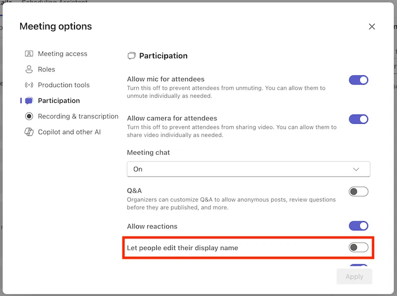 - Under “Participation”, turn on the “Let people change their display name” toggle.