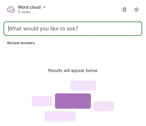 - Word cloud - Answers to questions are visualized as a “cloud” (participants answer in a short text form same as in Open text).