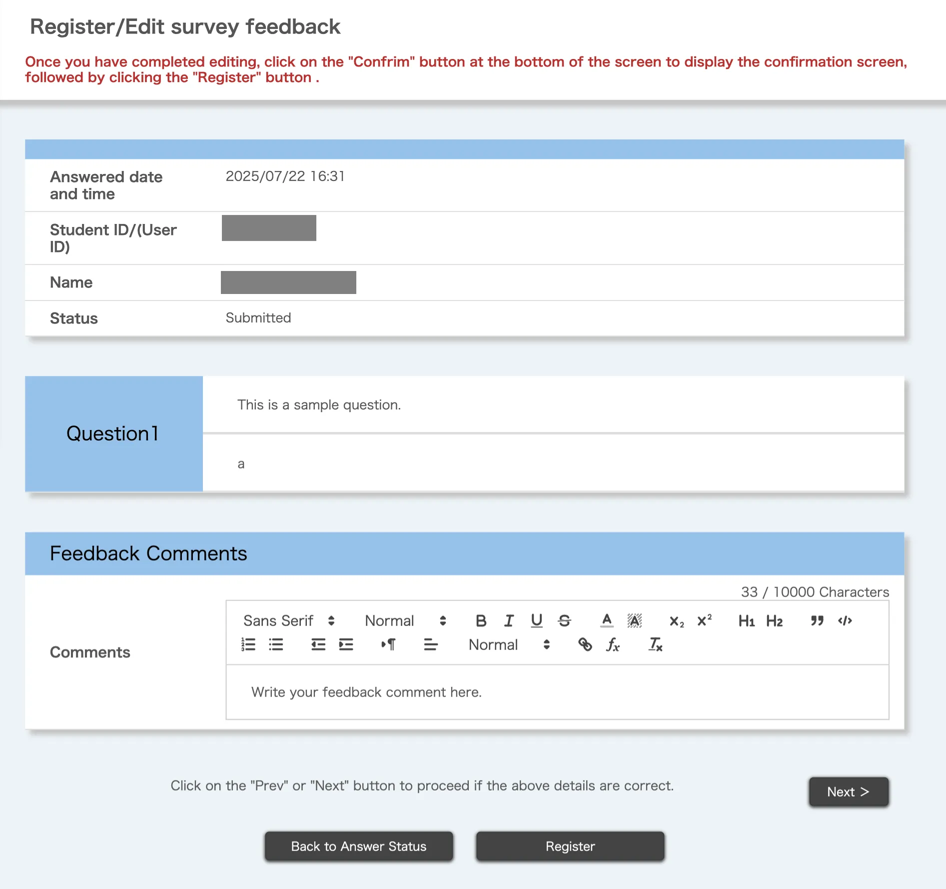 To register a feedback comment, enter your comment in the “Feedback Comments” field and click “Register”.