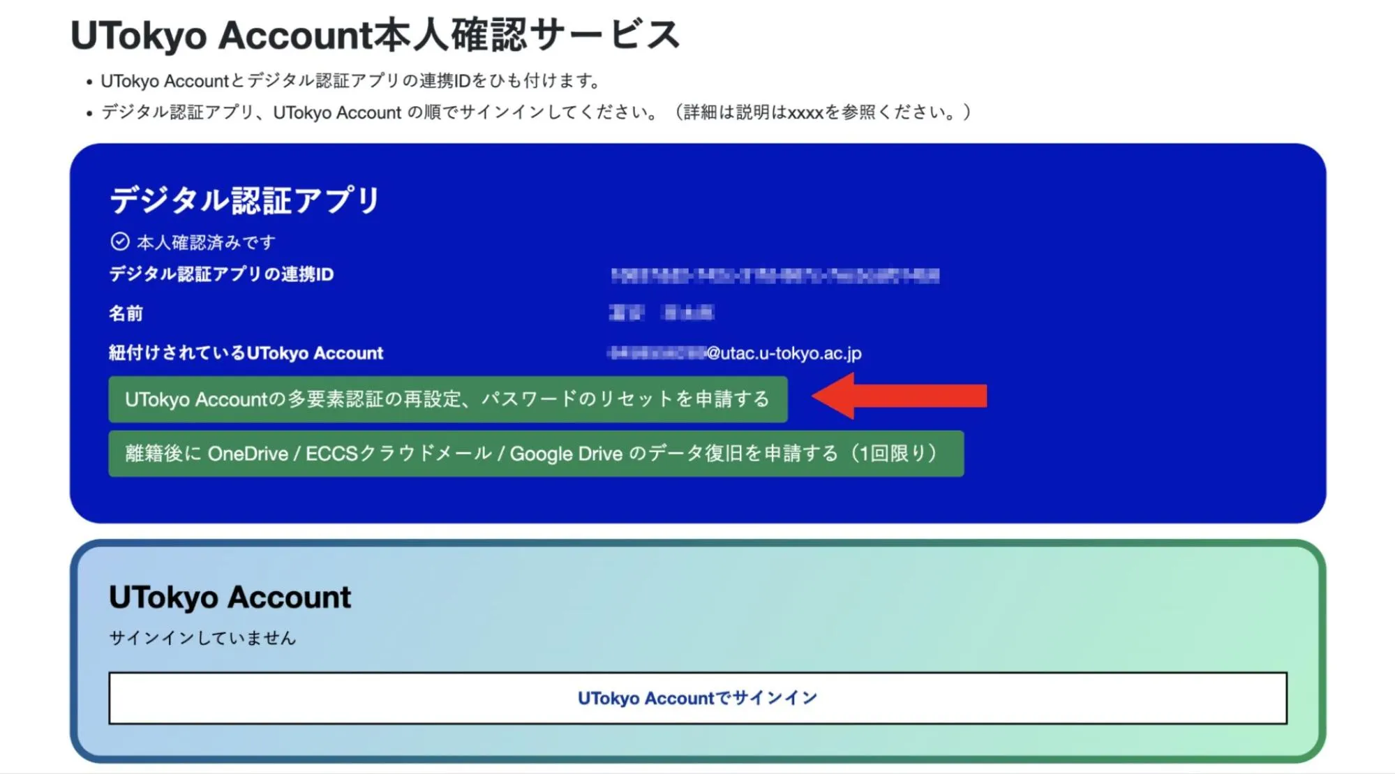 本人確認方法の再登録申請サイト上のリンクにアクセスし,UTokyo Accountでサインインしてください.サインインの際に多要素認証は不要となっております.